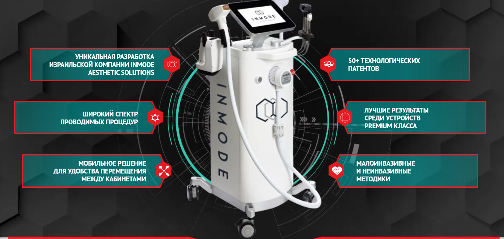 В InMode мы разработали решение для ключевой проблемы современных клиник — необходимости приобретать несколько дорогостоящих аппаратов для различных процедур. Теперь в одном устройстве доступны технологии IPL, радиочастотной терапии, лазерного воздействия и электролиполиза, — отмечает представитель InMode в России.