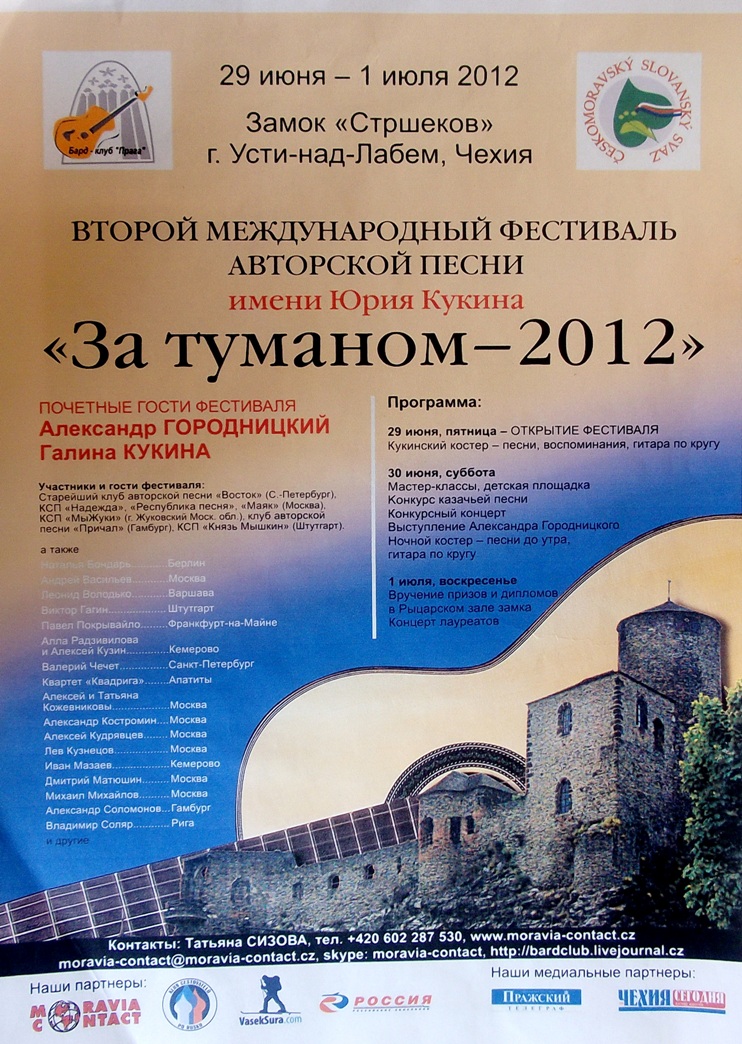 Приглашение  на  фесстиваль  им. Юрия Кукина  "За туманом"  в  Чехию: города Прага  и  Усть - над - Лабем,  в  замке  на  горе "Стршеков". С  29  июня по  1 июля 2012г.