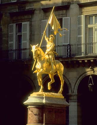Там где пересекаются улицы Риволи (названа в честь наполеоновской битвы в Пьемонте) и Пирамид (в честь его же битв в Египте), на небольшой площади стоит замечательный памятник, в яркий день ослепляющий солнечными бликами. Это памятник девушке прожившей короткую и удивительную жизнь шесть веков назад — Жанне д’Арк